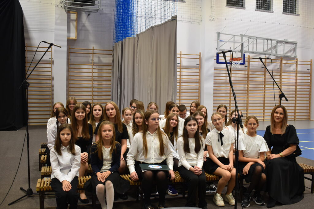 Drugą częścią uroczystości był program artystyczny przygotowany przez uczniów ZPO nr 1 pod kierunkiem p. Anny Sobolewskiej. Młodzi aktorzy wcielili się w role wybitnych sportowców. W ich osobach naszą halę odwiedzili: Adam Małysz – Filip Mieścicki, Iga Światek – Łucja Małek, Robert Lewandowski – Marcel Kasianiuk, Anita Włodarczyk – Amelia Żebrowska i Wilfredo Leon – Michał Chomicki. Wywiady z nimi przeprowadzał Wiktor Walczak, a uroczystość poprowadziły: Zuzanna Oponowicz i Malwina Jaszczuk. Chór, który doskonale sprawdził się w roli śpiewajacych kibiców, przygotowały panie E. Ostojska oraz K. Filimon. W programie artystycznym wzięli również udział najmłodsi przedstawiciele naszego Zespołu, czyli przedszkolaki z grup Pszczółki i Jeżyki, nad których przygotowaniem czuwały panie: A. Dziedzic, M. Chalimoniuk, A. Saczuk i S. Wróbel. Do występu uczniów i przedszkolaków śmiało dołączyły też panie: M. Frydrychowska i M. Chalimoniuk, które porwały słuchaczy do wspólnej zabawy, wyśpiewując, że “nie będę już więcej narzekać”, bo “szklanka jest zawsze w połowie pełna” i tak naprawdę choć “światem zaczęła rządzić jesień”, wystarczy “wsiąść do pociągu byle jakiego”.