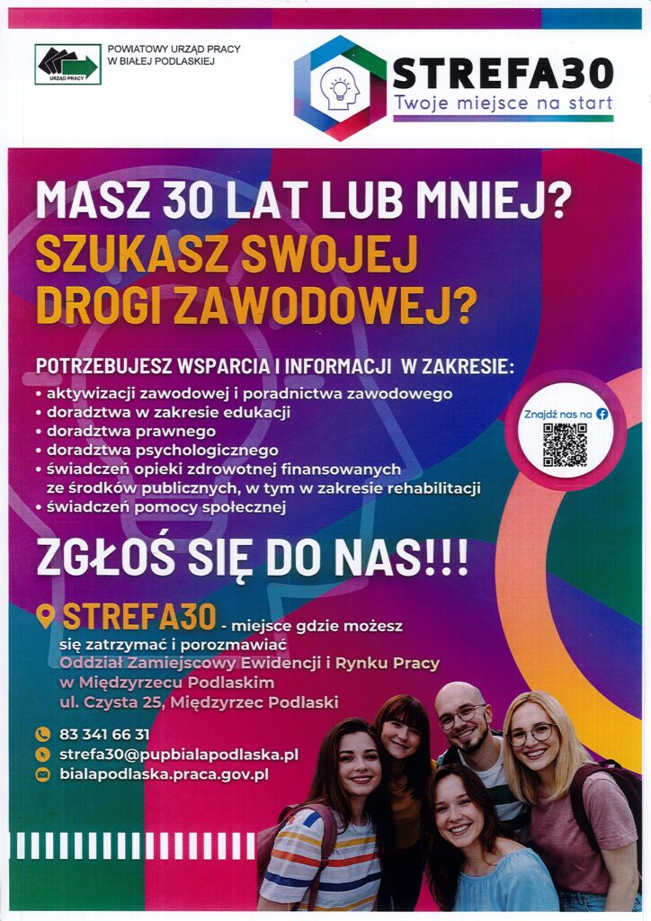 Powiatowy Urząd Pracy w Białej Podlaskiej otwiera w Oddziale Zamiejscowym Ewidencji i Rynku Pracy w Międzyrzecu Podlaskim punkt obsługi osób do 30. roku życia „STREFA30 – Twoje miejsce na start”. Jest to miejsce stworzone z myślą o młodych osobach stojących przed decyzjami edukacyjnymi, zawodowymi i życiowymi. Uroczyste otwarcie odbędzie się 27 lutego 2026r., zaś swoje funkcjonowanie rozpocznie od marca 2026r.