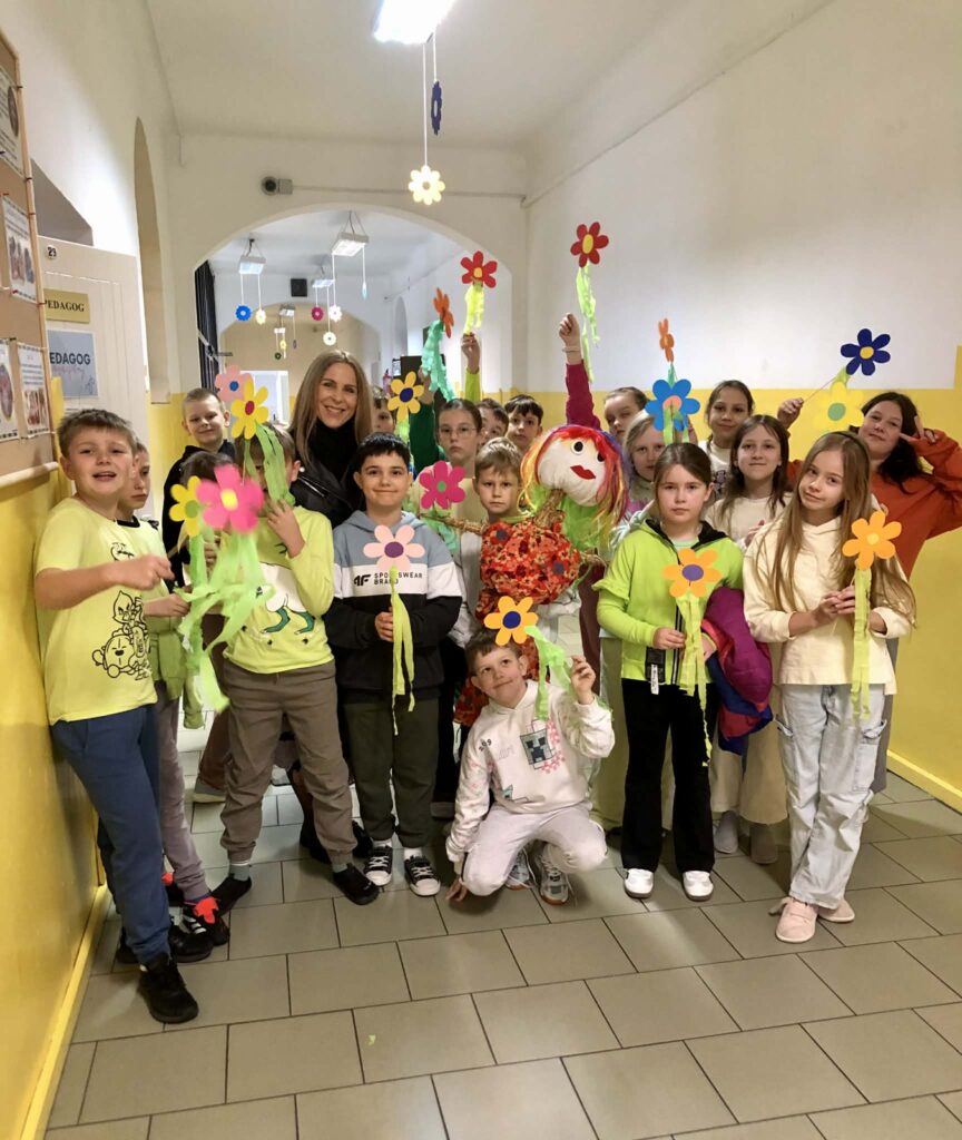 Pierwszy dzień wiosny uczciliśmy kolorowym, wesołym spacerem w rytmie muzyki, który wprowadził wszystkich w prawdziwie wiosenny nastrój. Dzieci dumnie prezentowały zielone akcenty – kwiaty, wstążki i inne barwne ozdoby, które symbolizowały budzącą się do życia przyrodę. Nie zabrakło również tradycyjnej marzanny – symbolu odchodzącej zimy, którą pożegnaliśmy z uśmiechem i małym hukiem.